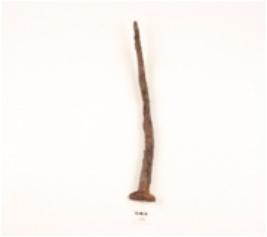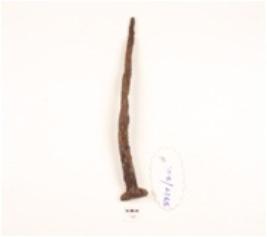 | Description / विवरण | A nail made on iron pointed on one end and broad on other end, rusted surface. |