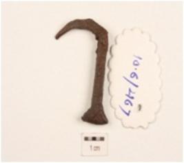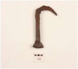 | Description / विवरण | A nail made on iron, pointed on one end and blunt on other, curved pointed edge, rectangular cross section, rusted surface. |