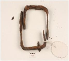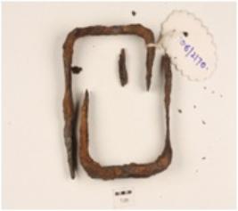| Description / विवरण | A iron nail nad bracket pointed on both end, curved on both end one part is smaller than other, rectangular in section, rusted surface. |