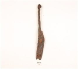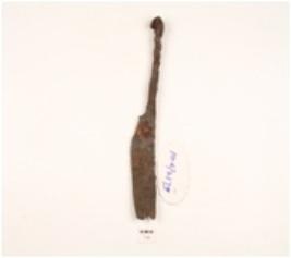 | Description / विवरण | A fragment of knief made on iron one end is sharp and damaged, chemically treated and rusted surface. |