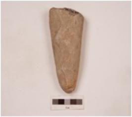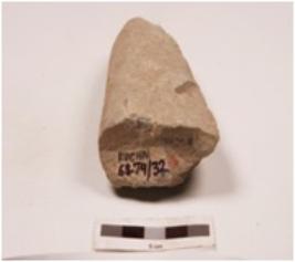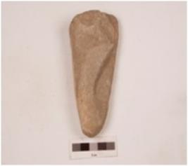 | Description / विवरण | A sandstone axe, flake scars on both sides, biconvex in cross section, pointed end and broken from working edge. |