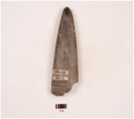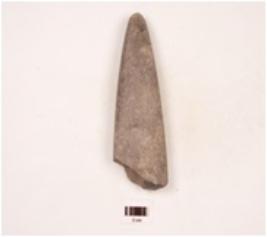 | Description / विवरण | Fragment of a celt made on basalt, pointed butt end, broken along cutting edge, thick lateral sides sloping at the broad base, broader uppar and lowe surface with a gentle slope, polished surface, rectangular in section. |