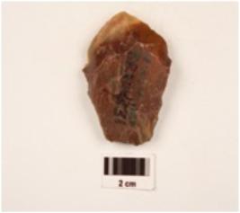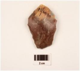 | Description / विवरण | Scraper made on end struck chert flake, flake scars on dorsal surface, prominent bulb on ventral surface, regular retouches along cutting edges, prepared platform. |