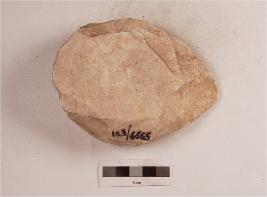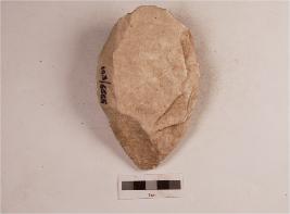 | Description / विवरण | A lanceolate handaxe with flake scars on the surface, made on quartzite flake, sides tapering into a pointed working end and rounded along the butt end, traces of cortex on the dorsal surface. |