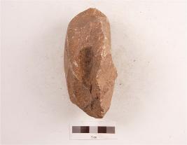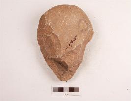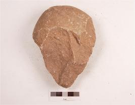 | Description / विवरण | A pebble butted bifacial handaxe made on quartzite, tapering sides ending anterior end and rounded along the posterior end, plano-convex in section. |
