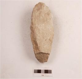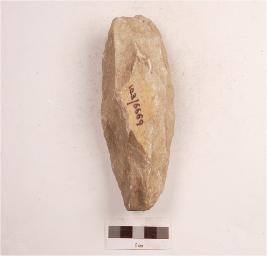 | Description / विवरण | A handaxe made on a quartzite flake with flake scars on the dorsal surface and cortex, pointed working end, flat on ventral surface. |