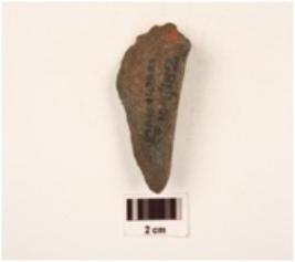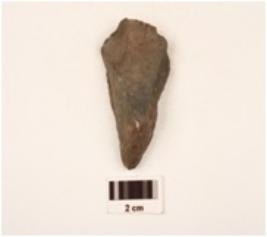 | Description / विवरण | End Scraper made on end struck flake, diffused bulb on ventral surface, flake scars on dorsal surface, partly retuoched cutting edges, triangular in section. |