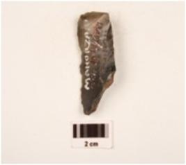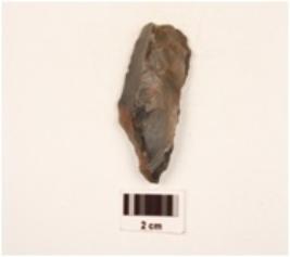 | Description / विवरण | Side scraper made on end struck chert flake, prominent ridge on dorsal surface triangular in section flake scars on surface, pointed distal end regular retouched cutting edges, ripple marks visible. |