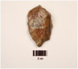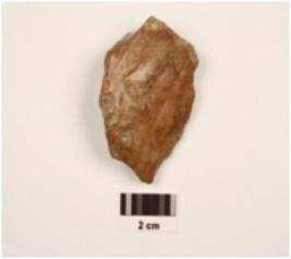 | Description / विवरण | A side scraper made on end struck flake, partly retouch along the edge, prepared platform, flake scars on dorsal side. |