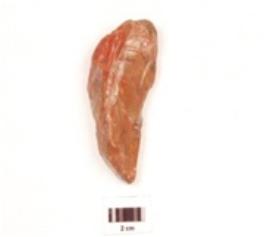 | Description / विवरण | A handaxe made on chert, end struck flake, uneven in shape, irregular retouch marks on edges, flake scars on dorsal side, plano convex in section. |