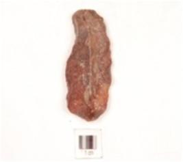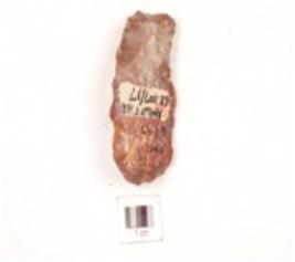 | Description / विवरण | A flake made on chert, mid ridge on dorsal side, use wear marks on edge, diffused bulb on ventral side, glossy surface. |