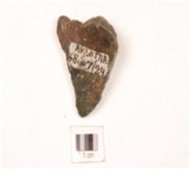 | Description / विवरण | A side scraper made on chert, use wear marks on edges, diffused bulb on ventral side, smooth and glossy surface. |