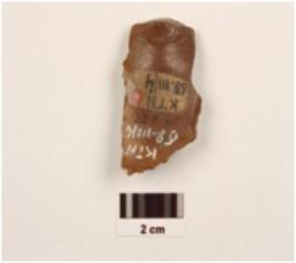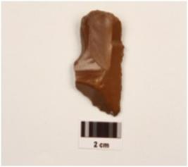 | Description / विवरण | A blade made of red jasper, on an end struck flake, prepared platform, prominent bulb at ventral side, flake scars on dorsal side, retouched working edges. |