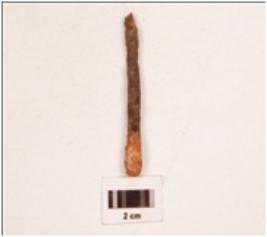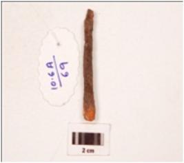 | Description / विवरण | A knobbed nail with rectangular section tapering to a pointed end, flat round head, rough surface. |