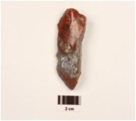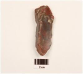 | Description / विवरण | An end scraper made of a red jasper on an end struck flake, prepared platform, prominent bulb at ventral side, single ridge on dorsal side, retouched working edge. |