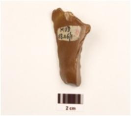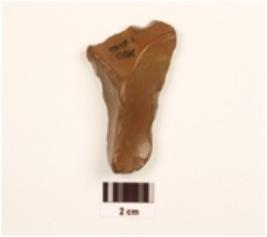 | Description / विवरण | A side scraper made of red jasper, on an end struck flake, prepared platform, prominent bulb at ventral side, regular retouched edges. |