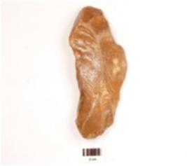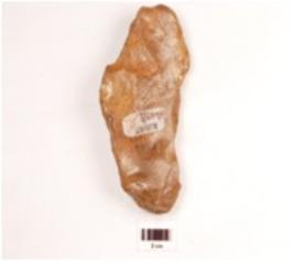 | Description / विवरण | A side scraper made on an end struck chert flake, prepared platform, prominent bulb on ventral side, ridge on dorsal side, one convex cutting edge with regular retouches, triangular in section. |