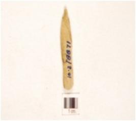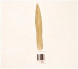 | Description / विवरण | A chert point, mid ridge on the surface, platform on the proximal end and use wear marks on the cutting edges. |