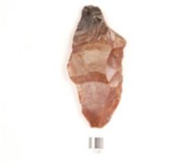 | Description / विवरण | A side scraper made on an end struck chert flake, prepared platform, prominent bulb on ventral side, sharp cutting edges with retouches. |