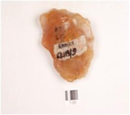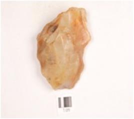 | Description / विवरण | A side scraper made on an end struck blade flake, prepared platfrom, prominent bulb on ventral side, five blade scars on dorsal side, plano-convex in section. |