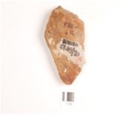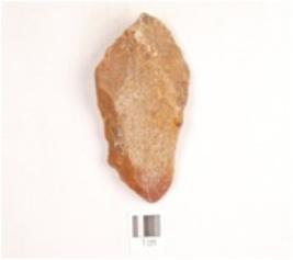 | Description / विवरण | A side side scraper made on an end struck chert flake, prepared platform, prominent bulb on ventral side, partly broken at one end, straight cutting edges with regular retouches. |