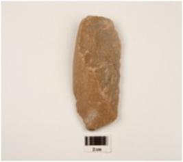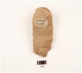 | Description / विवरण | Flake made on sand stone pebble with prepared platform, chipped off and cortex visible on dorsal side and diffused bulb on ventral side, use wear marks along cutting edges, triangular in section. |