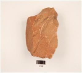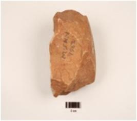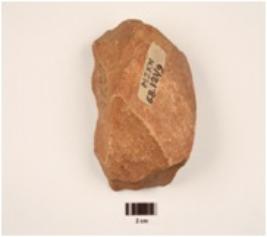 | Description / विवरण | A chopper made on quartzite pebble, unifacial butt end on posterior and cutting edges, on anterior end. Flake scars on surface. |