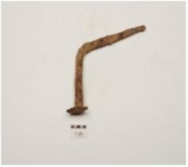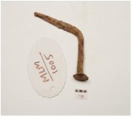 | Description / विवरण | A nail made on iron, broad circular head, intact other end, slightly bend body, rusted surface and square cross section. |