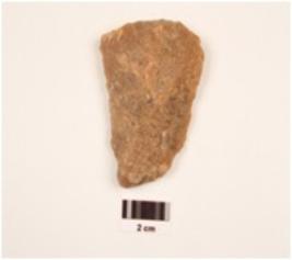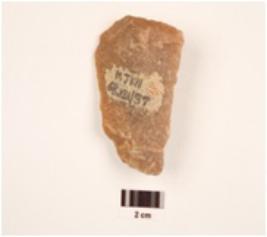 | Description / विवरण | A scraper made on quartzite end struck flake, convex in section, unifacail use wear marks on edges, diffused bulb on ventral side. |