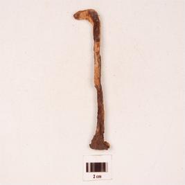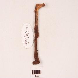 | Description / विवरण | A knobbed nail with rectangular section, tapering to a pointed end, broken flat round head, slightly curved, rough surface. |