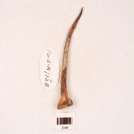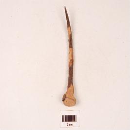 | Description / विवरण | A knobbed nail with rectangular section, tapering to a pointed end, flat round head, slightly curved, rough surface. |