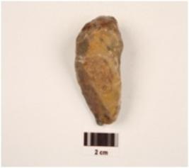 | Description / विवरण | A scraper made on quartzite end struck flake, concave in section, unifacial diffused bulb on ventral side, visible cortex on dorsal side, use wear marks on cutting edges. |