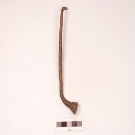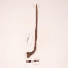 | Description / विवरण | A knobbed nail with round section, tapering to a pointed end, flat round head, slightly curved, rough surface. |