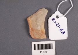 | Description / विवरण | A flake made on quartz with cortex on proximal end, broken |