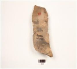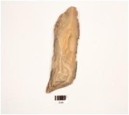 | Description / विवरण | A blade made on chere with a prominent mid ridge on dorsal side, prapared platform, bulb on ventral side, use wear marks on the cutting edges, triangular in section. |