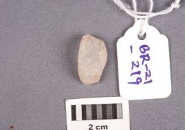 | Description / विवरण | Fragment of a core on quartz, with two blade flakes on the surface, broken at one end. |