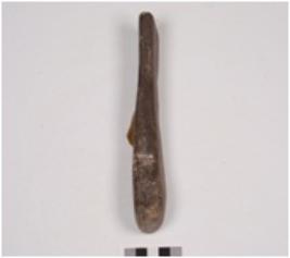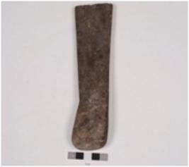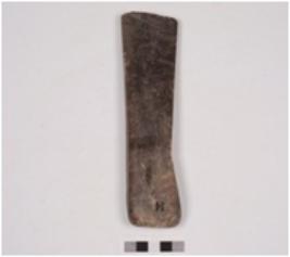 | Description / विवरण | A chisel made on stone with thick, broad distal end and thin flat pertially broken proximal end, rectangular in cross section, polished surface. |