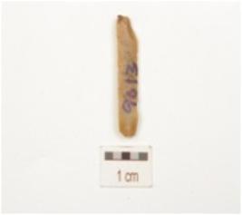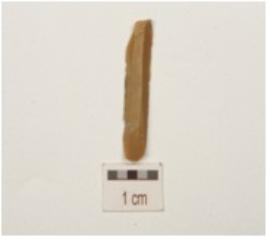 | Description / विवरण | Fragment of a blade, made on chert, detached from a prepared core, ridge on dorsal side, diffused bulb on ventral side, broken distal end and use-wear marks along the cutting edge. |