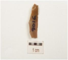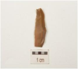 | Description / विवरण | Fragment of a blade, made on chert, ridge on dorsal side, prepared platform,, broken along distal end , triangular in section use-wear marks along the cutting edge. |