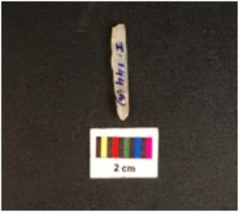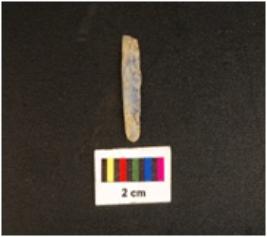 | Description / विवरण | Parallel sided microlithic blade with mid ridge on dorsal. Diffused bulb on proximal end. Triangular in section and use wear marks on cutting edges. Broken at distal end. |