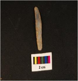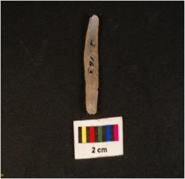 | Description / विवरण | Parallel sided chalcedony blade, mid-ridge on dorsal, flat ventral, distal end, use wear edges, slightly blue in colour. |