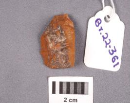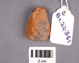 | Description / विवरण | A scrapper made on chert with flake scars on the dorsal surface, prepared platform and diffused bulb on the ventral side with irregular cutting edges. |