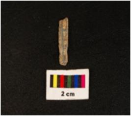| Description / विवरण | Parallel sided blade, double ridge on dorsal side, trapezoidal in section, improminent bulb on ventral side, broken at distal end, use wear marks along the cutting edges. |