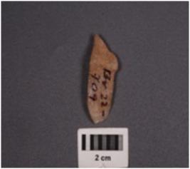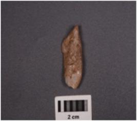 | Description / विवरण | Fragment of a blunted blade with one blunted lateral surface, partly broken proximal end, diffused bulb on ventral surface, intact distal end. |