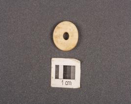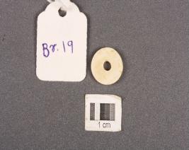 | Description / विवरण | Circular shaped disc bead, made on shell with smooth surface and perforation in the middle. White in colour with a circular black band on edge. |