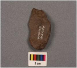 | Description / विवरण | Side scraper detached from on end struck flake, prepared platform, bulb on ventral side, irregular retouch on the left and right cutting edge on dorsal side. |