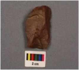 | Description / विवरण | A side scraper detached from on end struck flake, prepared, platform bulb on ventral side, irregular retouch on the right cutting edge on dorsal side. |