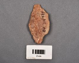 | Description / विवरण | End scraper on end struck flake, made on quartz, use wear marks on edges, prominent bulb and partly broken. |