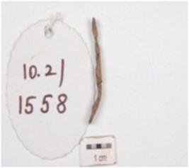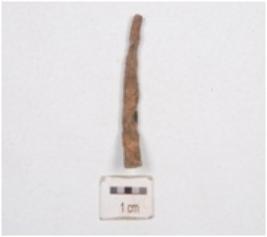 | Description / विवरण | Fragment of a copper nail, narrow at one end and rough surface. |