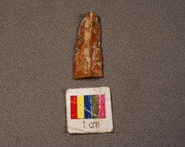 | Description / विवरण | Parallel sided micro-blade use wear marks on cutting edges and prominent mid-ridge on dorsal. Triangular in section and bulb on ventral side. Prepared platform. |